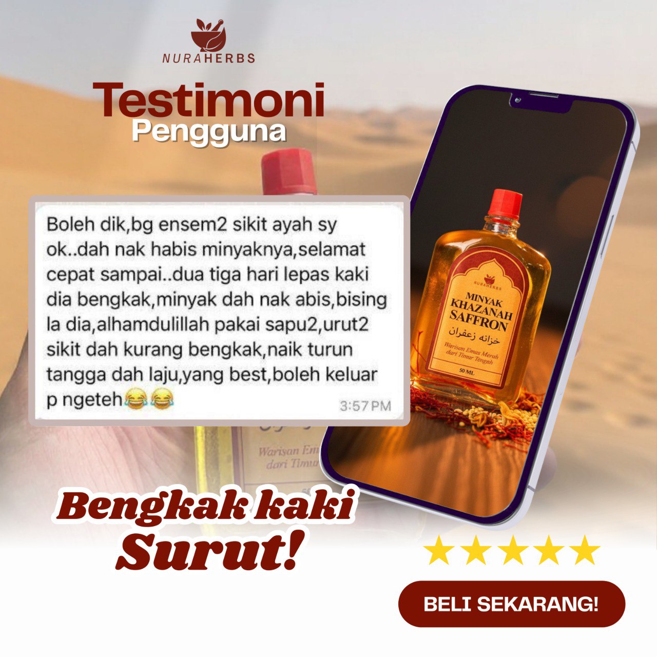 Ini bukan minyak urut biasa yang anda jumpa di pasar malam. Ini adalah Minyak Urut Aromaterapi Premium yang dirumus khas dengan Saffron tulen (ya, nampak helai saffron dalam botol!).